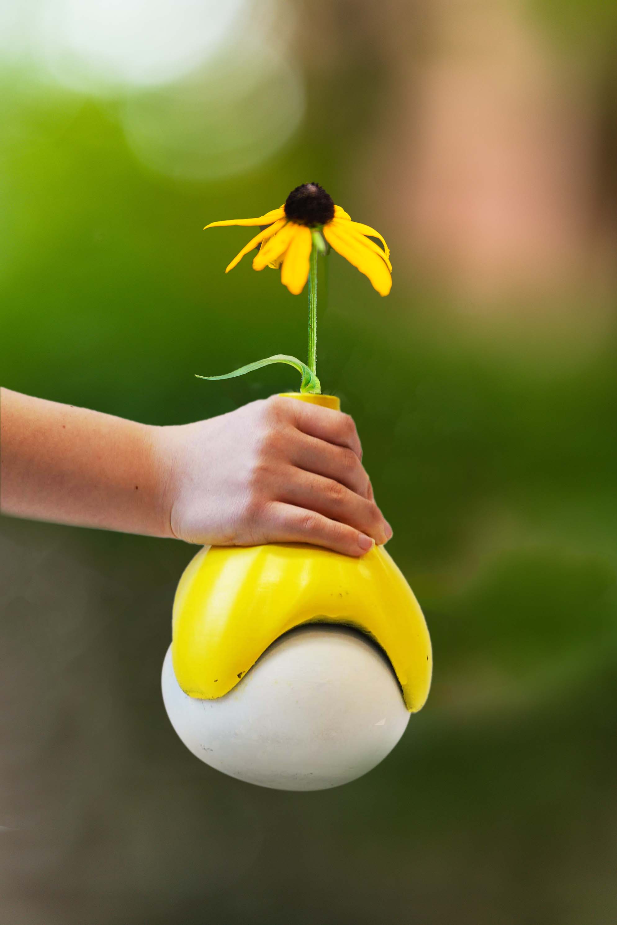 Captured in motion, our Purrfect Versa-Vase showcases its unyielding stability. Playful interaction meets resilient design as a hand test its limits, but the vase bounces back effortlessly.