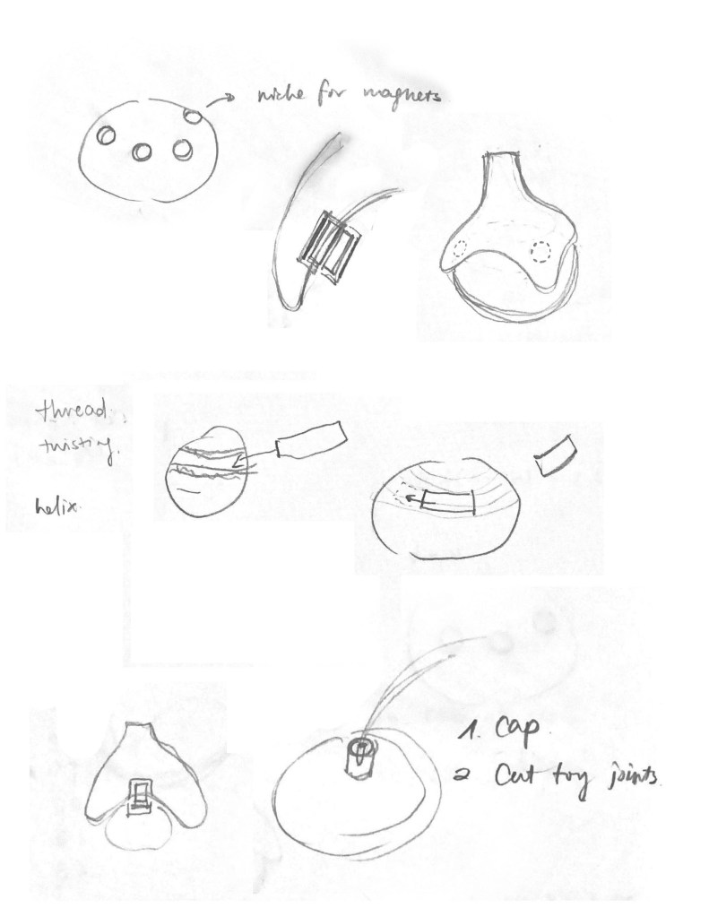 To ensure the two parts conveniently for user use, we considered a magnetic attraction, a screw cap design, and a mortise-tenon joint design. After prototyping and testing, we found that both screwing and mortise-tenon joint were ineffective in securing the heavy bottom and required significant effort. We settled on a strong magnetic attraction, as it provides a secure hold while allowing for easy opening with a gentle twist of the vase. However, studying the mortise- tenon joint structure greatly assisted us in determining the connection method between the cat toy and the base: the mortise-tenon joint plus a magnet become the way to connect the cats’ toy and the heavy base.