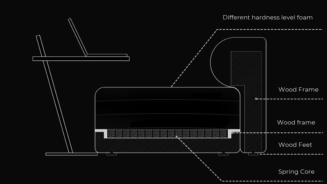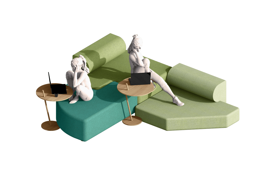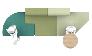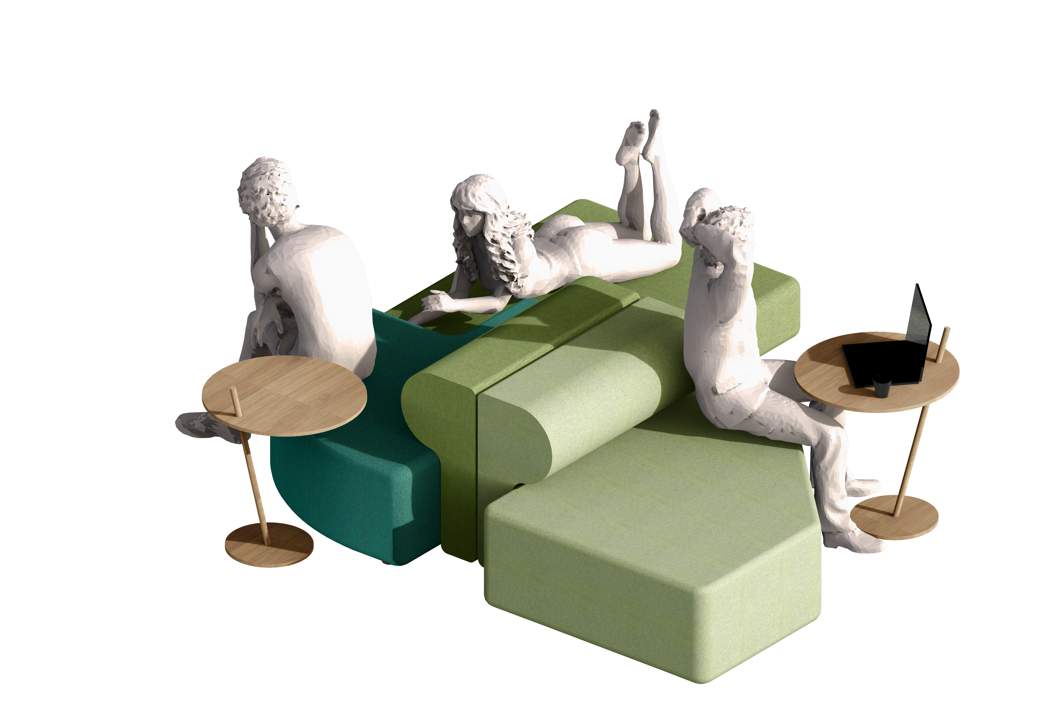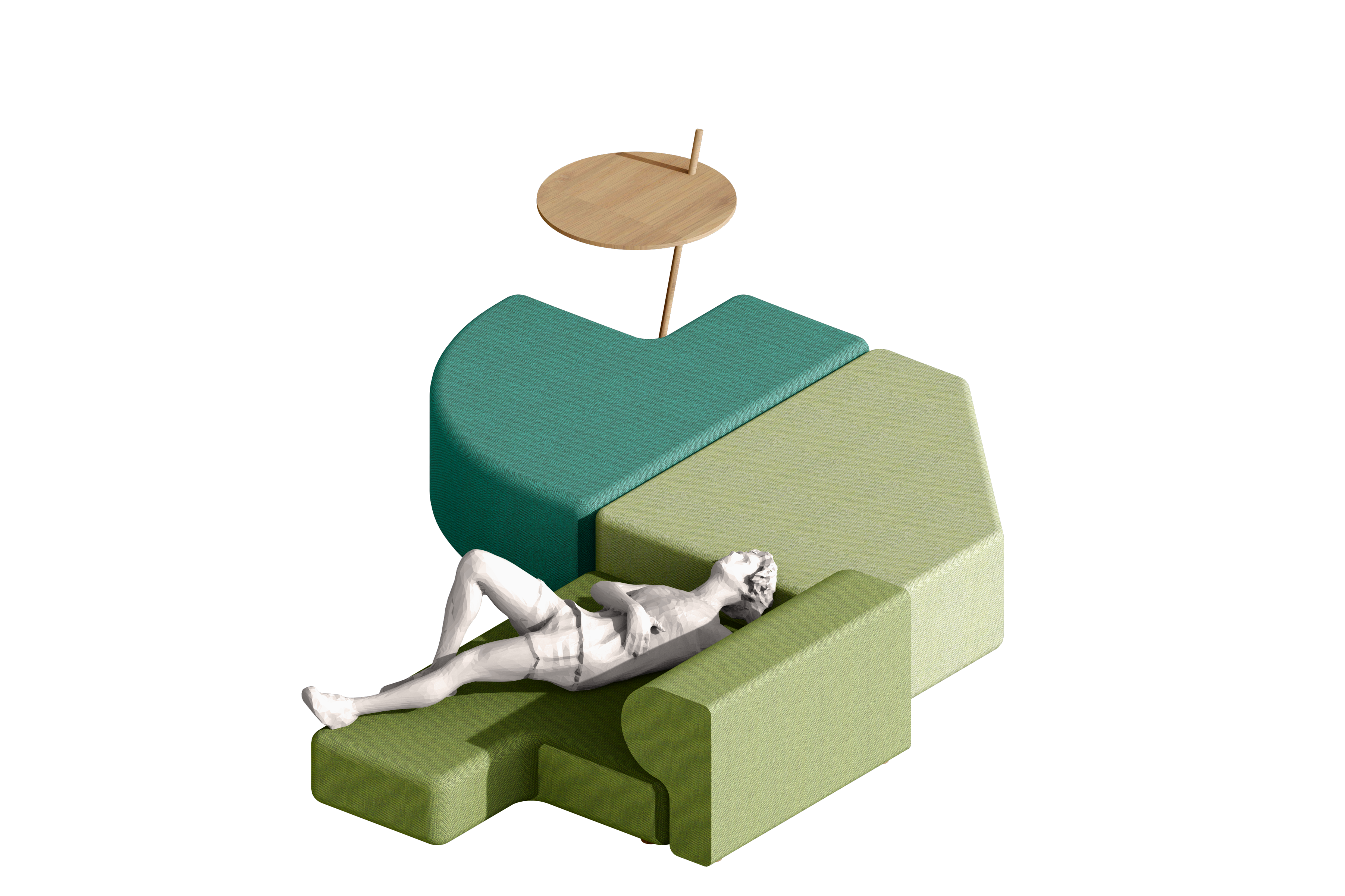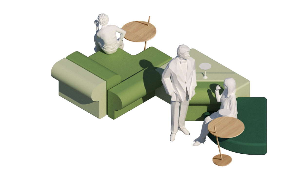The furniture can be flexibly transformed into relaxing seating arrangements, offering a variety of cozy, sheltered spaces where guests can unwind, feel protected, and enjoy a moment of peace without disturbance.